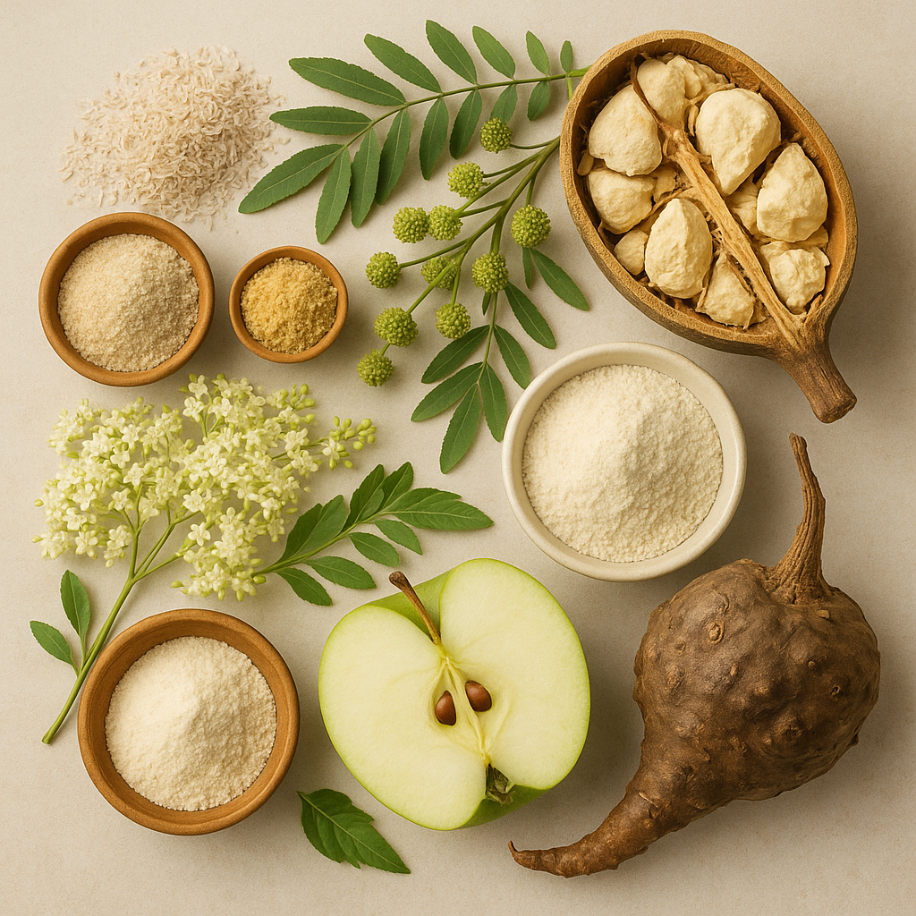 Apfelpektin ist ein klassischer Bestandteil vieler Obstsorten und wird aufgrund seiner weichen, löslichen Ballaststoffstruktur geschätzt. Die Holunderblüte verleiht der Mischung eine leichte pflanzliche Note und fügt einen weiteren natürlichen Aspekt hinzu.