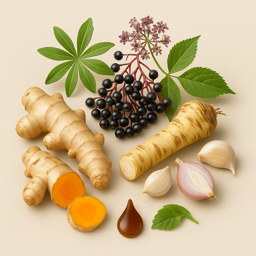 - Kräuter-Wurzel-Essenz: Ein sorgfältig ausgewählter Mix aus Kräutern wie Waldmeisterkraut, Zwiebeln, Knoblauch und verschiedenen Wurzeln wie Ingwer, Kurkuma und Meerrettich ergänzt die einzigartige Formel.